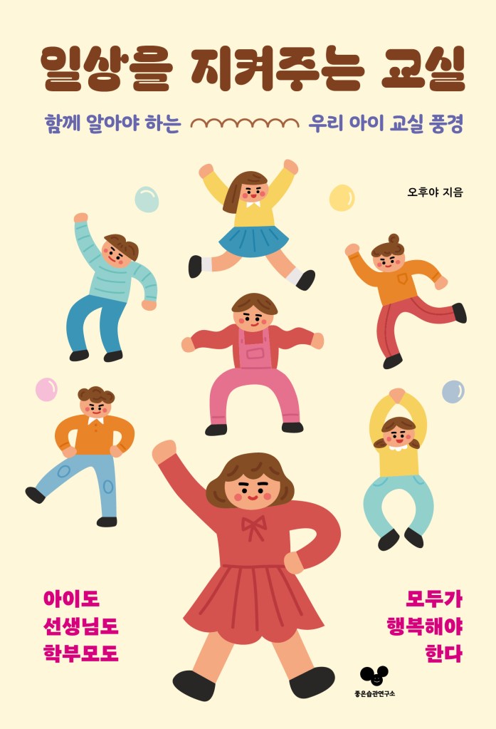 교사와 부모가 함께 지켜야 할, 아이들의 평범한 하루. “선생님은 아이들의 일상을 지켜주는 사람입니다.” 초등 교사로 18년간 아이들과 함께해온 저자 오후야 선생님의 교실 이야기를 담은 에세이. 이 책은 어느 날 갑자기 교사 일이 버겁게 느껴졌던 한 사람이, ‘아이들과 함께한 일상’의 의미를 되짚으며 다시 교실로 돌아가기까지의 여정을 담고 있다. 아이가 지우개를 잃어버려 급식을 못 먹겠다며 울던 일, 선생님에게 “신경 끄세요!”라고 말하는 아이를 다독이던 순간, 너무나 씩씩하고 열정적이었던 옆 반 선생님을 신경정신과 병원에서 마주쳤던 일 등. 『일상을 지켜주는 교실』은 교사의 시선에서 쓰였지만, 결국은 모든 학부모와 교육 당국자가 함께 고민해야 할 이야기다. 행복한 ‘교실’을 만들어가는 동료로서, 교사와 부모가 지켜야 할 습관 22가지도 함께 알아본다. (2025년 8월 1일 출간)