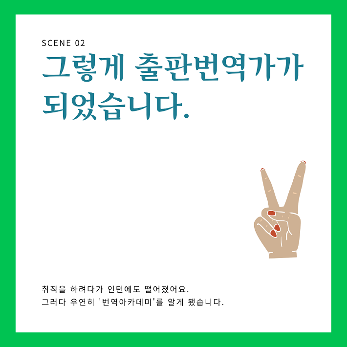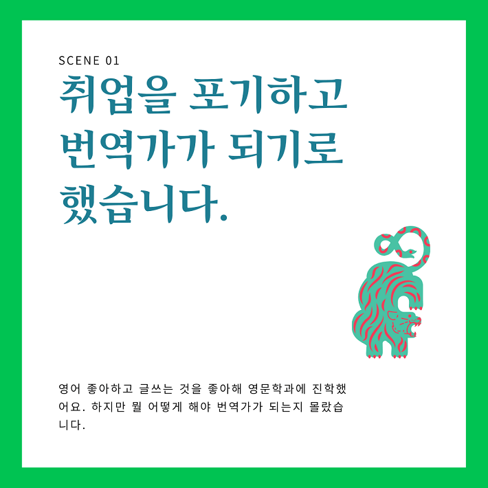 고등학교 때부터 장래 희망이 번역가였습니다. 책 좋아하고 영어 좀 하고 글 좀 쓰니까 딱이라고 생각했죠. 그래서 무턱대고 영문과에 진학했어요. 그런데 뭘 어떻게 해야 번역가가 될 수 있는지 알 길이 없는 겁니다. 번역가들은 다 어디에 꽁꽁 숨어 있는지 물어볼 데도 없고 책이나 인터넷에도 마땅한 정보가 없었어요. 별수 없이 회사나 들어가자고 생각했죠. 근데 회사는 아무나 들어가나요? 휴학하면서 인턴을 지원했다가 똑 떨어졌습니다. 바로 그때 번역 아카데미가 제 앞에 나타났습니다. 앞뒤 안 재고 냅다 등록했죠. 실제로 해보니까 재미있었어요. 선생님도 곧잘 한다고 칭찬해주시고요. 그래서 과감히 결정했죠. 어차피 조직 생활 체질은 아니니까 죽이 되든 밥이 되든 좋아하는 일을 하자. 그렇게 출판번역가가 됐습니다.