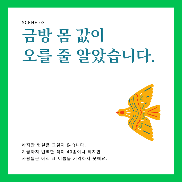 처음에는 한 5년쯤 일하면 베스트셀러 막 터지고 몸값이 쫙 오를 줄 알았어요. 자신만만했죠. 근데 실제로 5년쯤 일해보니, 막상 그렇진 않더라고요. 제가 지금까지 번역한 책이 40종이나 되지만 여러분 중에 제 이름을 기억하는 사람은 아무도 없을 거예요. 현실은 그렇더라고요.