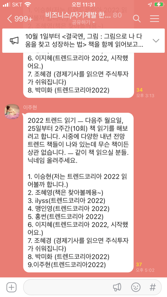 2022년 트렌드 읽기 책이 많이 출간되었습니다. 이중 각자 한 권을 정해 10회(주 5일씩, 2주간)에 걸쳐 책을 읽어보려고 합니다.