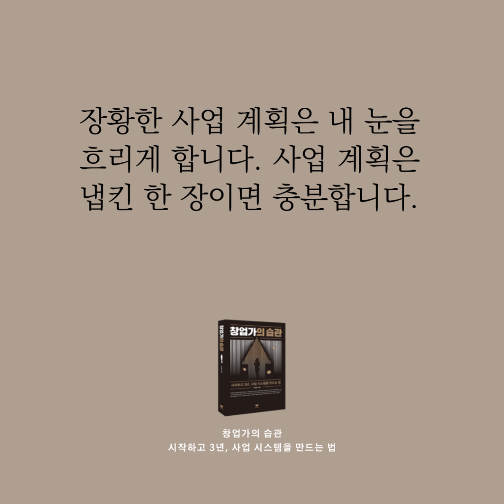팔기 시작해야, 다음 길이 보입니다. 가다가 막히면 스케치만 고치면 됩니다. 사업 계획은 냅킨 한 장이면 충분합니다. 장황한 사업 계획은 내 눈을 흐리게 합니다. 그리고 헤매게 합니다.