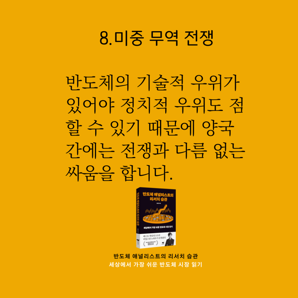 미국과 중국의 반도체를 둘러싼 경제 전쟁의 역사를 훑고, 미래를 전망해 보고 싶다면 <반도체 애널리스트의 리서치 습관> 책을 꼭 읽어보세요. 아주 쉽게 핵심만 넣어서 정리했습니다.