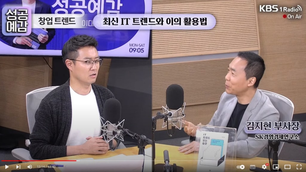 2023년 6월 8일 KBS 1 라디오 “성공예감 이대호입니다”에 <IT 트렌드 읽는 습관>의 김지현 SK 경제경영연구소 부사장님 출연. 책 내용을 소개하고, 최신 IT 뉴스 읽기를 어떻게 해야 하는지도 알려주었다. 내용을 요약하면 아래와 같다.