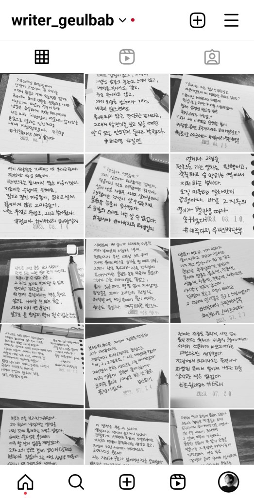 나는 필사한 내용을 사진으로 찍어서 올리는 #필사스타그램 계정도 운영한다. 나만의 해시태그를 만들어서 필사 사진을 올려놓으면 나중에 특정 문장을 다시 찾아보기도 쉽다. 아무래도 필사 노트가 여러 권 쌓이면, 필요한 문장을 찾을 때 어디에 있는지 뒤적거리는 시간이 길어진다. 온라인 기록을 병행하면 그런 점이 보완된다.