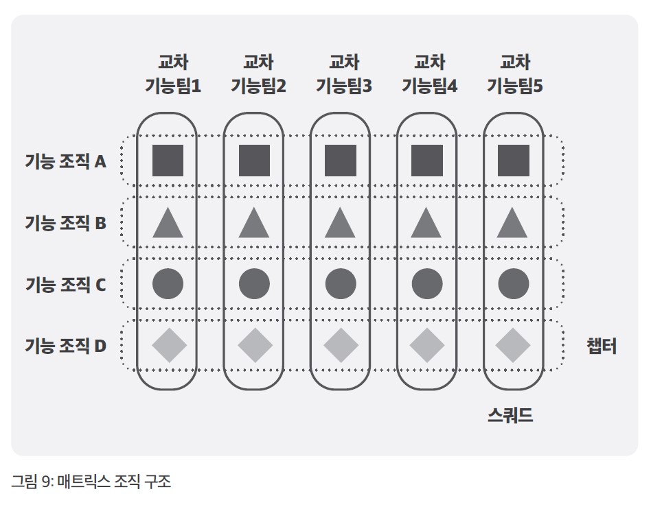 13) 애자일 조직으로 유명한 스포티파이의 스쿼드와 챕터 형태가 전형적인 매트릭스 조직 구조이다. 그림 9의 ‘스쿼드’는 프로젝트 조직으로 ‘고객’과 ‘시장’의 비즈니스를 지향한다. 기능 조직인 ‘챕터’는 ‘기술’과 ‘학습’을 지향한다. 단순히 조직도 모양을 바꾼다고 새로운 조직 구조가 작동하는 것은 아니다. 매트릭스 조직의 성공은 프로젝트 조직과 기능 조직 간의 거버넌스(운영/통치 방식)를 효과적으로 운영할 때 가능하다.