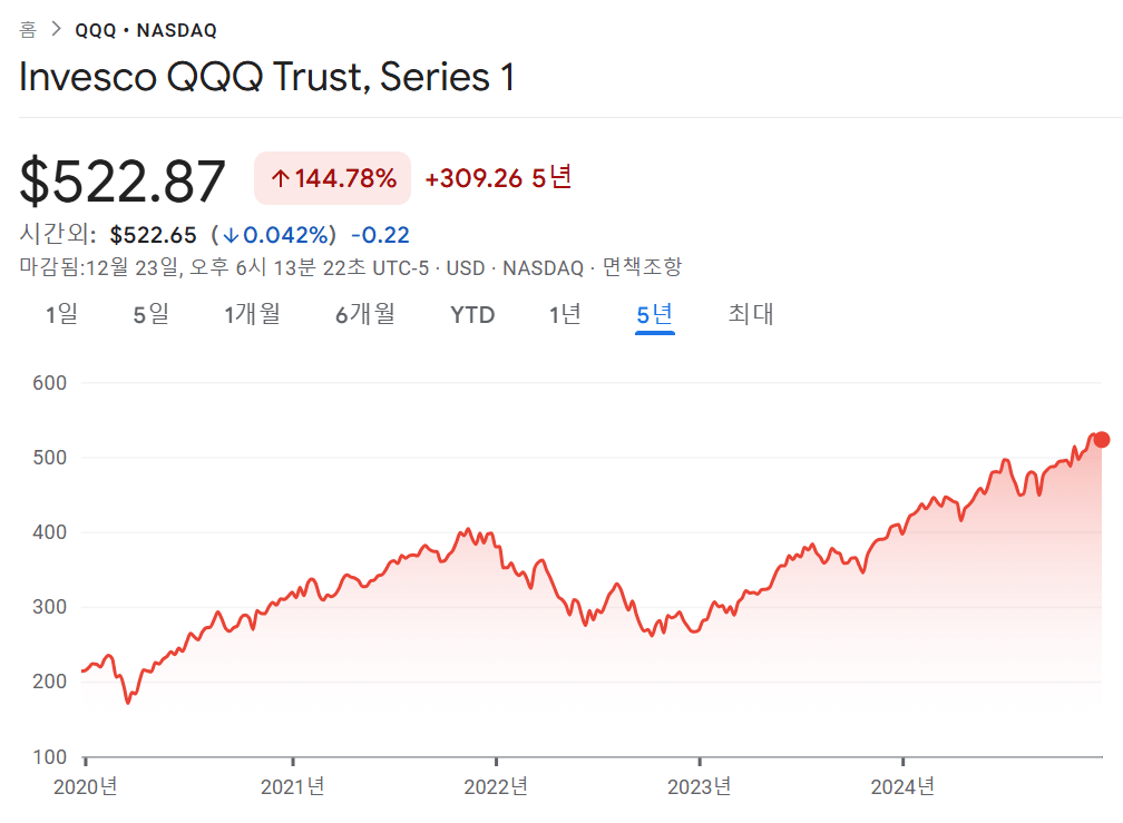 S&P 500에는 미국을 대표하는 전통 우량 대형주가 있고, 나스닥 100에는 중소형주도 포함되어 있기 때문에 배당률 차이가 날 수밖에 없습니다. 대신 QQQ는 기술주 중심이다 보니 전통 대형 우량주보다는 성장성이 높은 ETF라 할 수 있습니다.