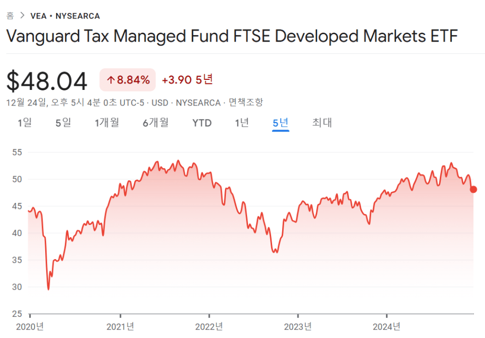 10위는 미국을 제외한 선진국가인 일본, 캐나다, 영국, 프랑스, 독일에 투자하는 VEA입니다(한국 기업에도 일부 투자하고 있다고 합니다).