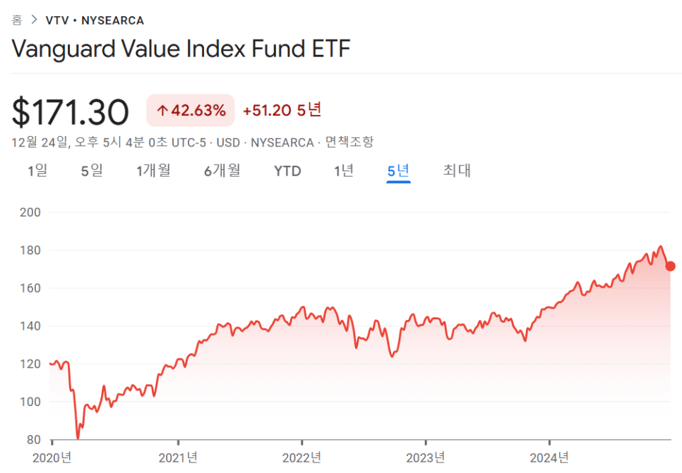 6위는 미국의 대형 가치주에 투자하는 VTV입니다. 운용 보수가 0.04%로 저렴하고 세전 배당률이 2.46%입니다.