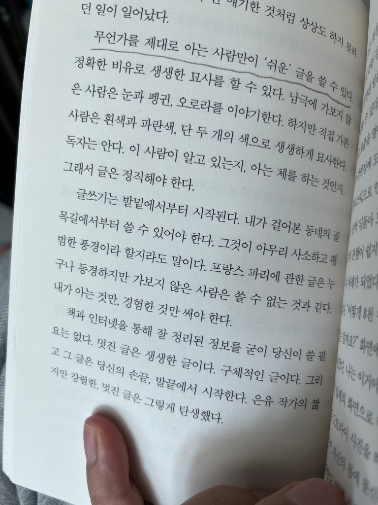 “무언가를 제대로 아는 사람만이 ‘쉬운’ 글을 쓸 수 있다. 정확한 비유로 생생한 묘사를 할 수 있다. 남극에 가보지 않은 사람은 눈과 펭귄, 오로라를 이야기한다. 하지만 직접 가본 사람은 흰색과 파란색, 단 두 개의 색으로 생생하게 묘사한다.