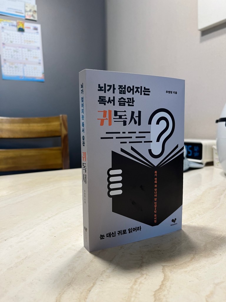 스크린의 노예가 된 눈을 해방하기 위해 귀를 새로운 소통 창구로 삼은 것입니다. 저는 귀를 매개로 삼은 새로운 독서법을 “귀독서”라고 이름 지었습니다. 문자를 배우고 나서 지금까지 평생 해온 독서법은 눈으로 책을 읽는 “눈독서”였습니다. (38쪽)