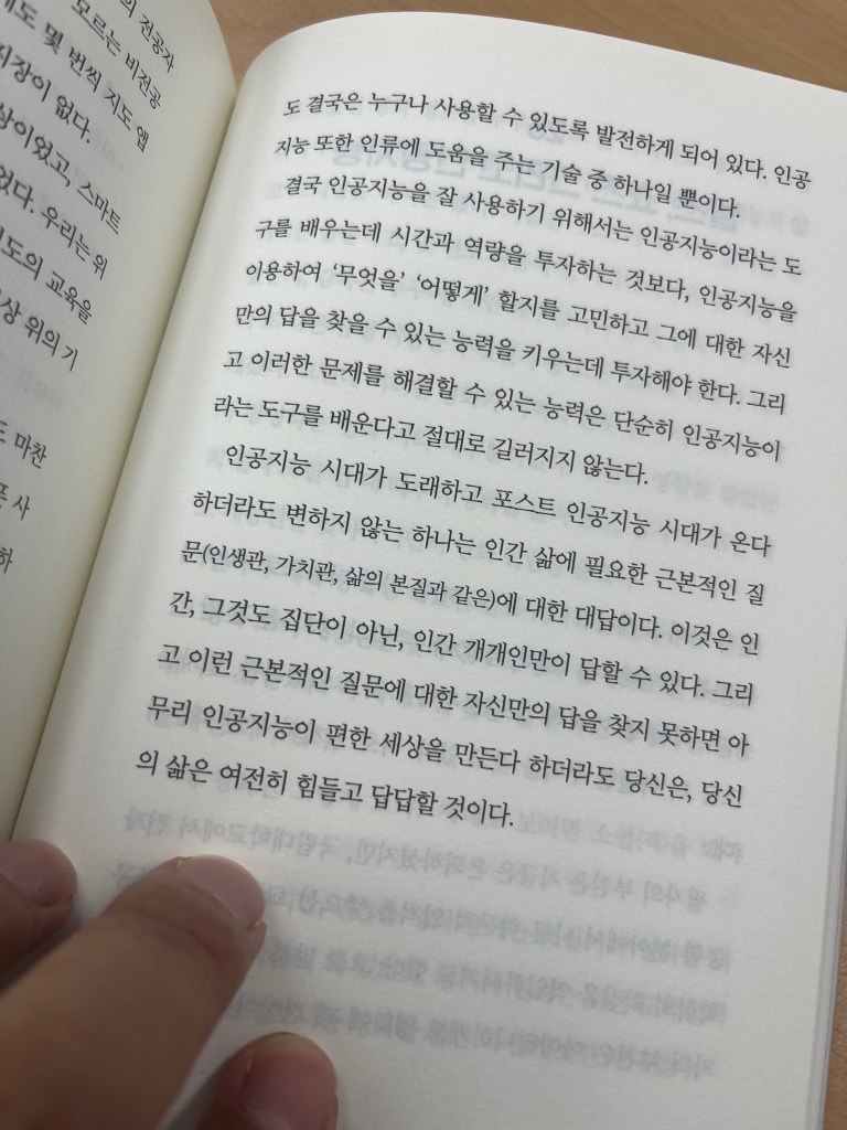 인공지능 시대가 도래하고 포스트 인공지능 시대가 온다 하더라도 변하지 않는 하나는 인간 삶에 필요한 근본적인 질문(인생관, 가치관, 삶의 본질과 같은)에 대한 대답이다. 이것은 인간, 그것도 집단이 아닌, 인간 개개인만이 답할 수 있다. 그리고 이런 근본적인 질문에 대한 자신만의 답을 찾지 못하면 아무리 인공지능이 편한 세상을 만든다 하더라도 당신은, 당신의 삶은 여전히 힘들고 답답할 것이다.